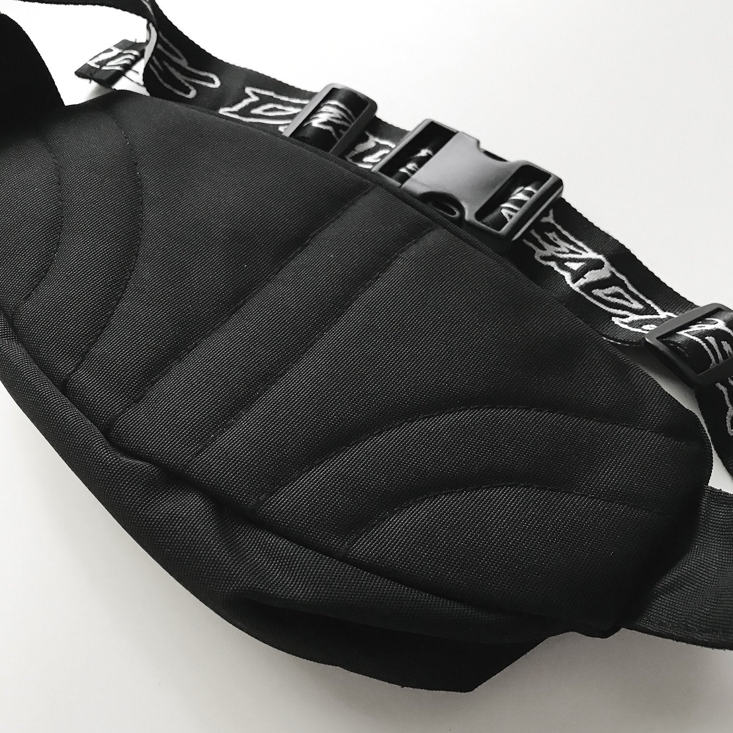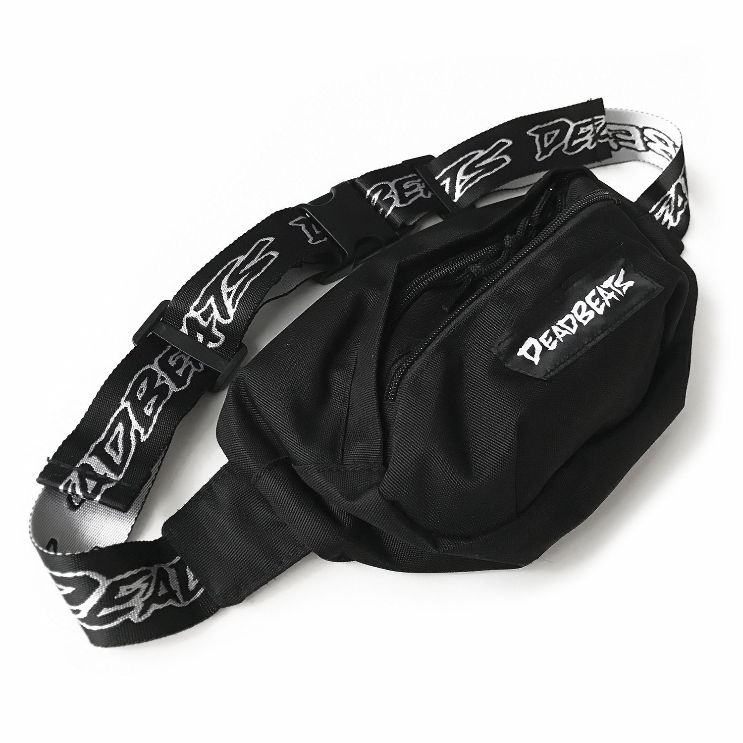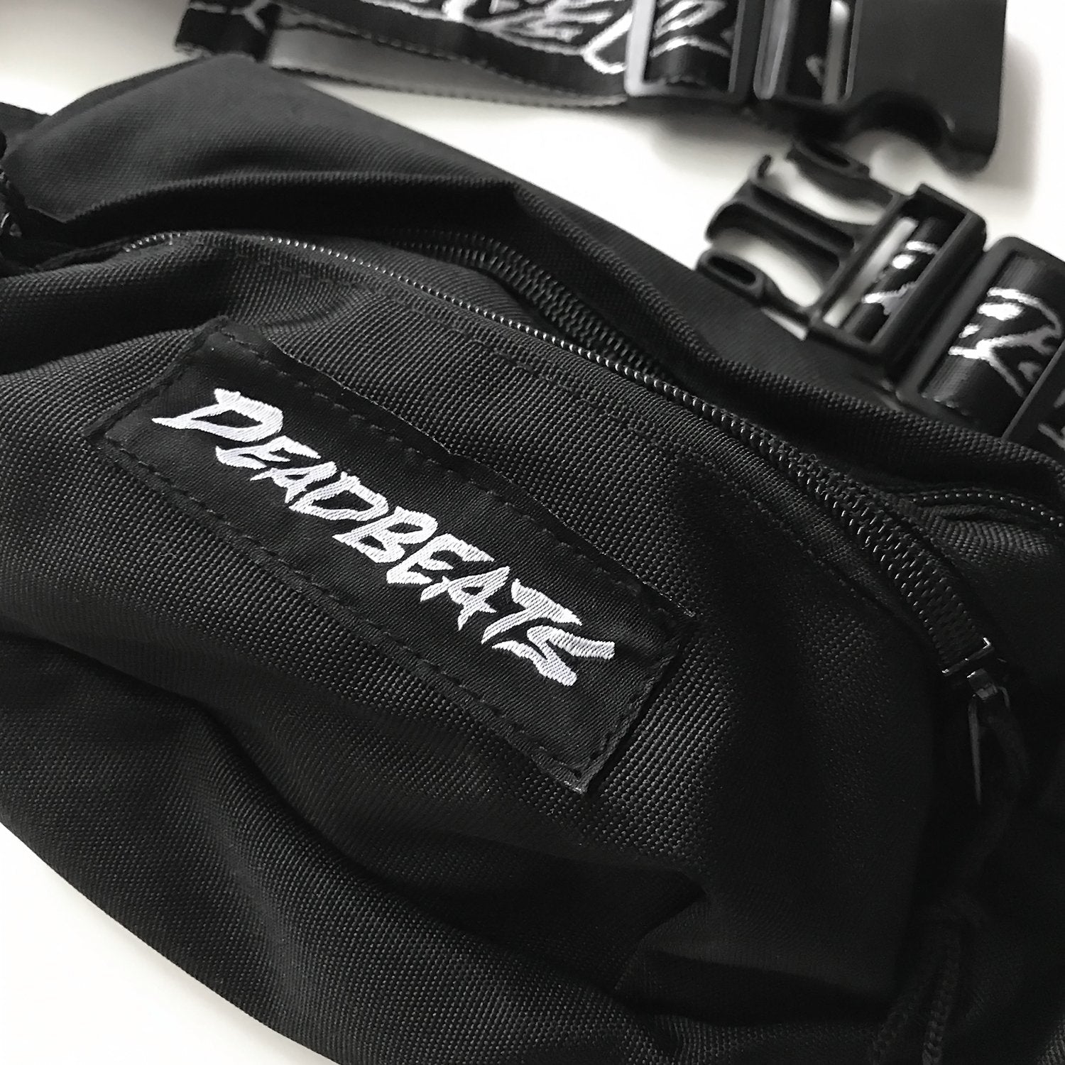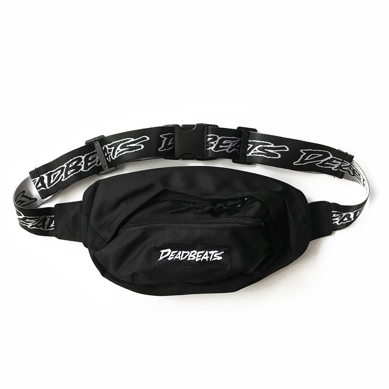 Deadbeats Custom Fanny Packs feature 2 individual zippered compartments, adjustable strap, and front logo. Rugged construction, with a padded back panel. Measures approximately 11.5" x 6".